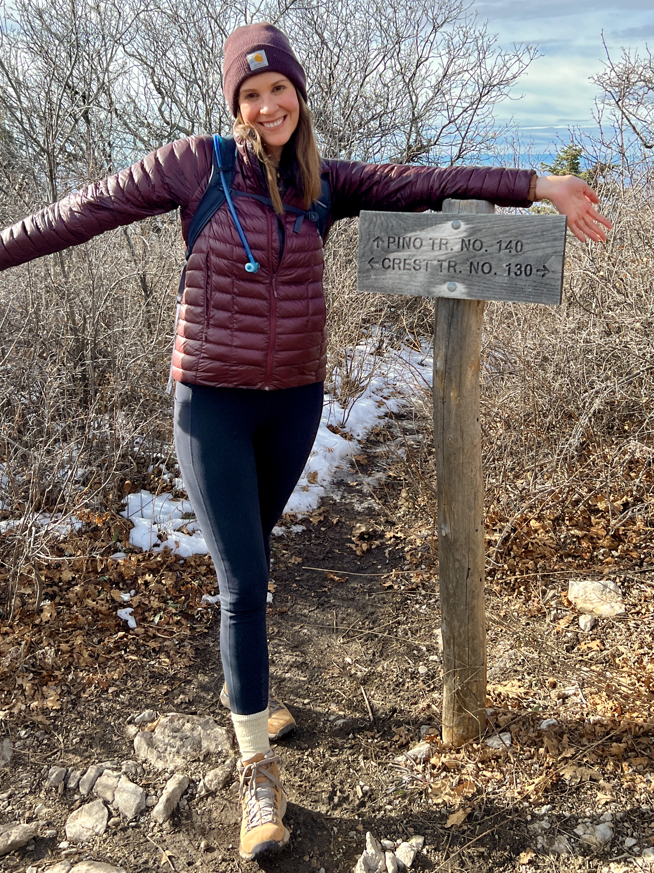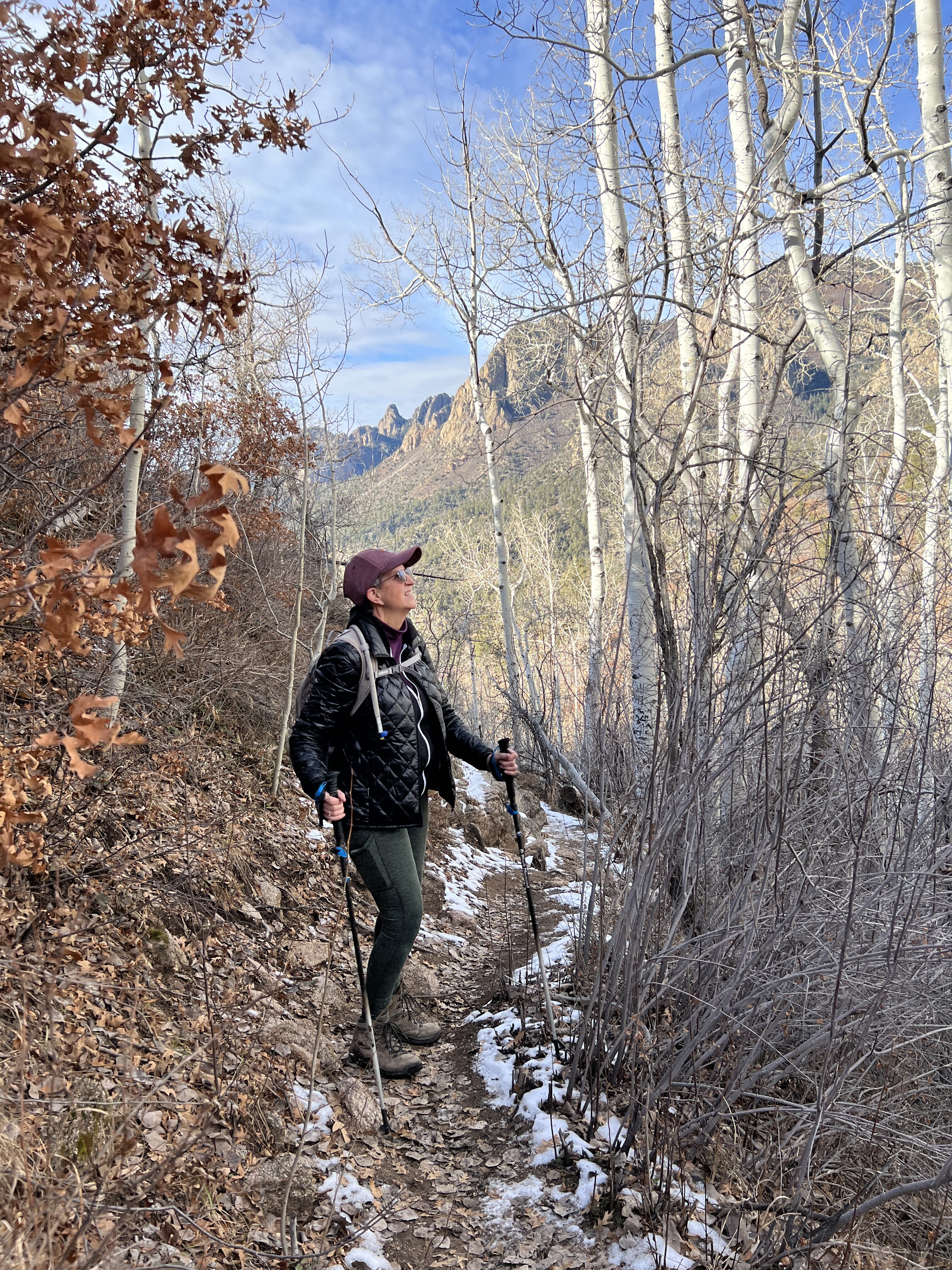 As the trail climbs higher, it passes through beautiful ponderosa pine forest and even some aspen groves. After about 5 miles of steady uphill hiking (including a steep section of switchbacks near the top), we managed to stumble out of the scrub oak to the trail intersection sign, celebrating the fact that there was no additional “up” to climb on the Pino Trail. Of course, we could have continued on up the Crest Trail, but we had maxed out our legs at that point. The return trip was much easier, and we had covered 10.1 miles by the time we returned to the trailhead.