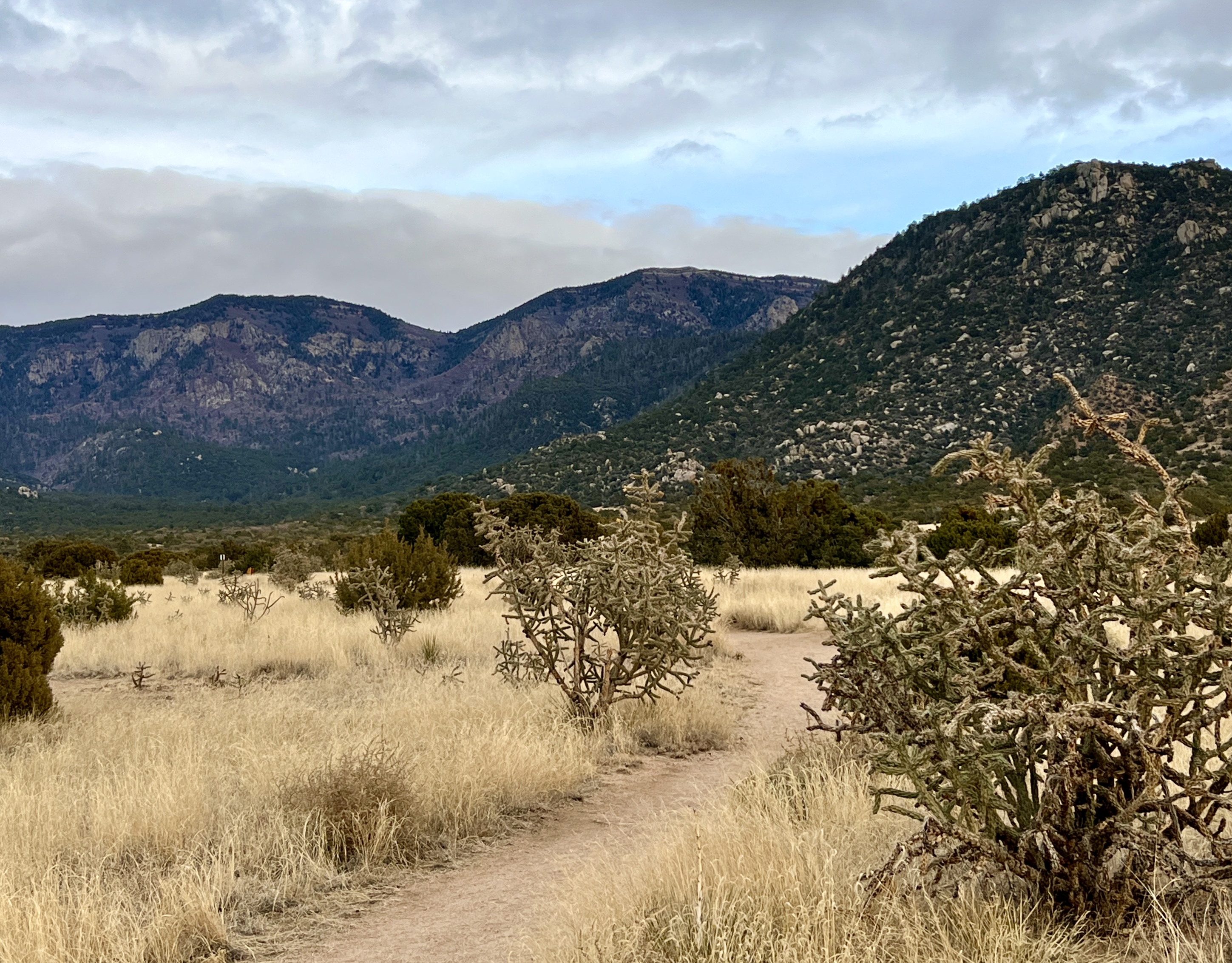 Originating in the Elena Gallegos Open Space at the eastern edge of Albuquerque, the Pino Trail is very popular. At its lower end it’s a very pleasant, gradual climb that rolls through pinon-juniper forest with killer views and interesting rock formations. There’s a neat historic marker sign at the start of the trail where one can learn about Doña Elena Gallegos (1680-1731). She was a daughter of early 17th-century Hispanic colonists, and married Santiago Gurulé, a “tattoed Frenchman.” Possibly ahead of her time, Elena Gallegos apparently had an appreciation for good body art.