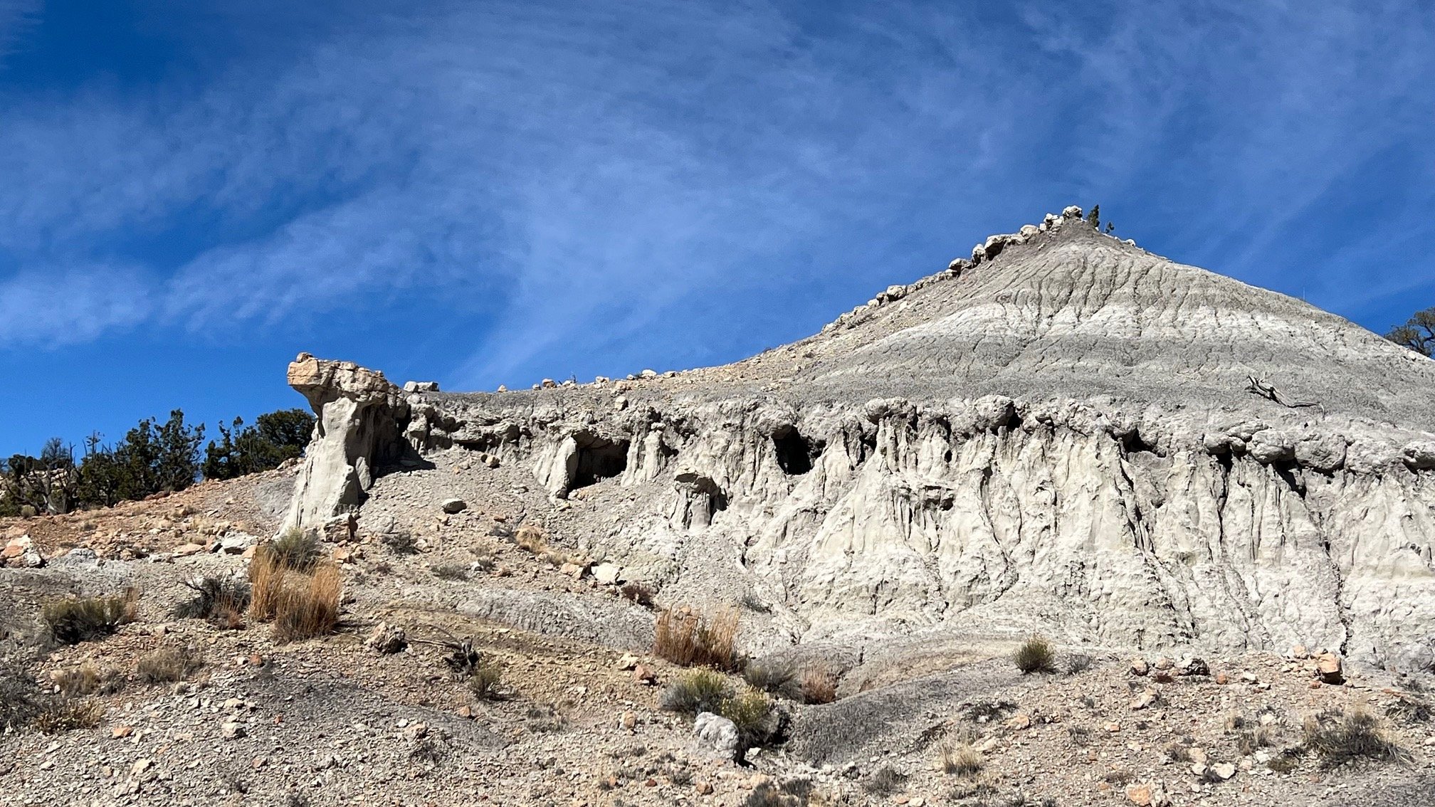 Out in the vastness of northwest New Mexico, in almost every direction from the world-class ruins of Ancestral Puebloan Chaco Canyon National Historical Park, are badland jewels like Ah-Shi-Sle-Pah, Bisti/De-Na-Zin, and Ojito Wilderness Areas.  But largely unknown to most are the BLM areas west of Cuba, whose highly eroded trailless ravines and mesa tops conceal an exotic otherworldly zone of fossils, hoodoos, and petrified wood, all interspersed with sweet spots of pinon/juniper and scattered Ponderosa pine forests.