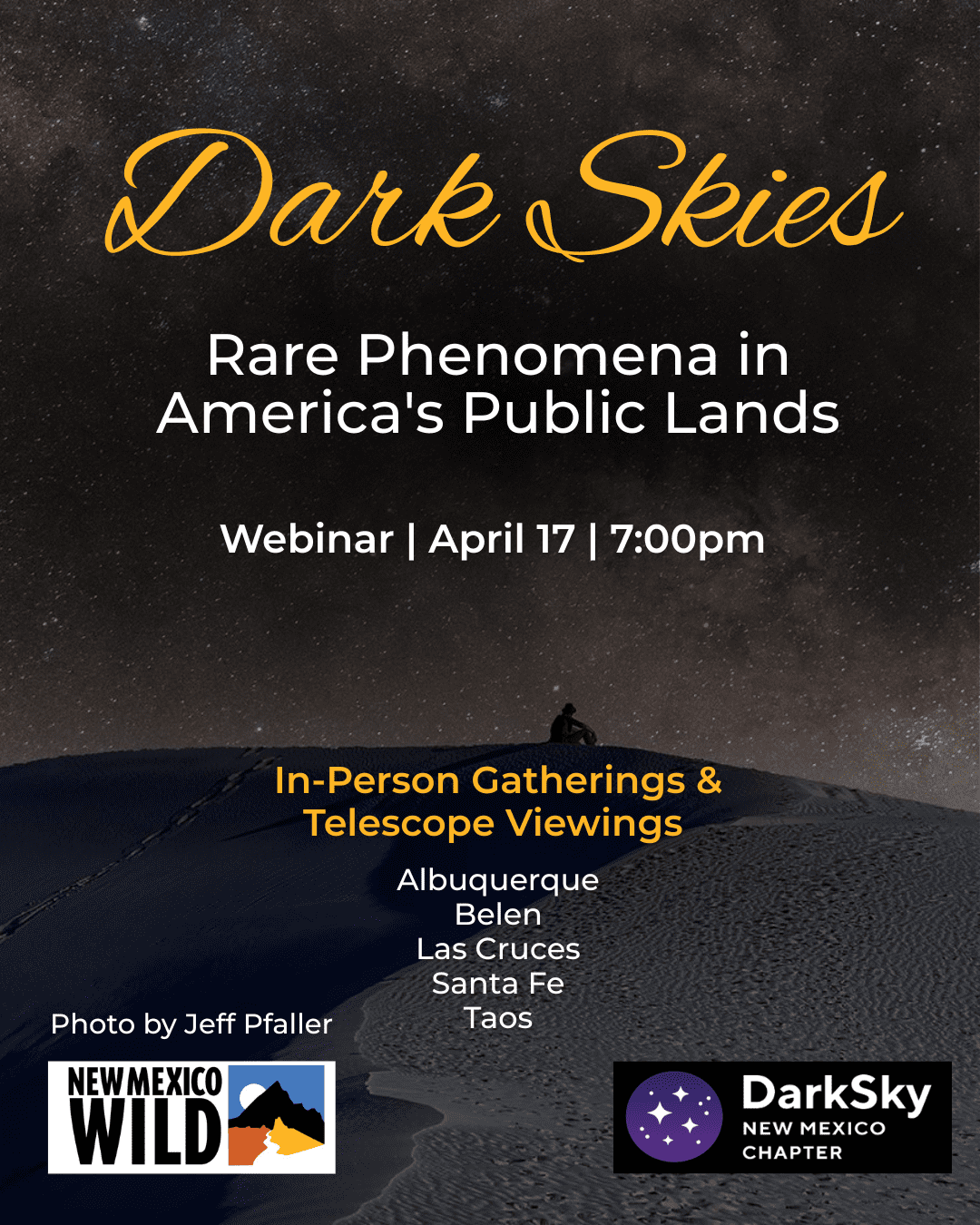 Join us for an evening with award-winning photographer Jeff Pfaller as he shares his 5-year journey exploring America's public lands at night. You'll hear about rare dark sky phenomena and tips for experiencing these bucket-list moments yourself.