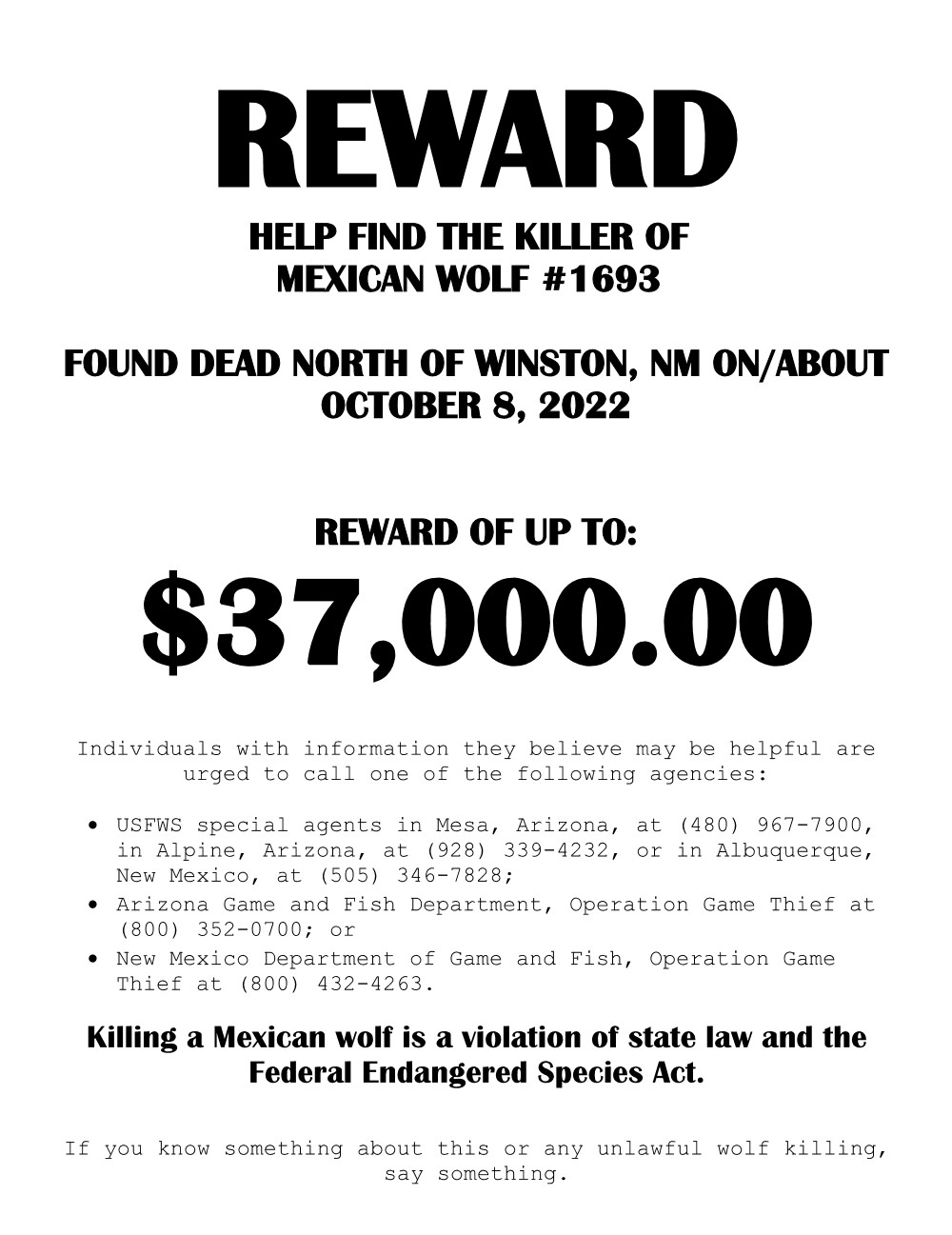 On October 8, 2022, another endangered Mexican gray wolf was found illegally killed in southwestern New Mexico. Grenville was the father of the Seco Creek Pack, and one of the most genetically valuable wolves in the wild. Killing a Mexican wolf violates the Endangered Species Act and the NM Wildlife Conservation Act and is subject to civil and criminal penalties. This case is under law enforcement investigation. New Mexico Wild and several other advocacy groups have contributed to a combined $37,000 reward for information leading to the conviction of the killer(s) of the Mexican gray wolf.