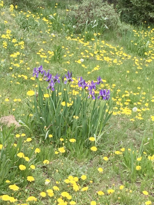 Purple Iris and Yellow dandelion remind me of a passage from the book Braiding Sweetgrass discussing why these two colors look so good together
