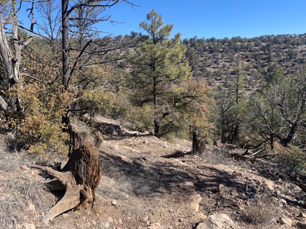 Splintered tree stumps line a trail that one of the first Gila rangers carved into the wilderness’ interior around 1911.