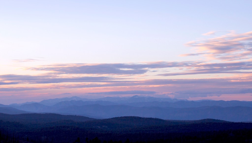 Sunset crowns the western rim of the Gila Wilderness with rose-gold twilight, as seen from the Aldo Leopold Vista.